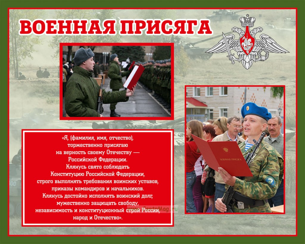 Военная присяга является отражением духовных и нравственных ценностей службы в Вооруженных Силах Российской Федерации. Военнослужащие при присяге обязуются соблюдать Конституцию Российской Федерации, законы Российской Федерации, долг, принять ее стандарты и требования. Присяга является гарантией надежности и дисциплинированности военнослужащих.