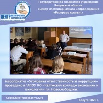 ГБУ КО ЦПС «Расправь крылья!» организовало мероприятие, посвященное уголовной ответственности за коррупционные нарушения, в ГАПОУ КО «Калужский колледж экономики и технологий» (площадка по ул. Новослободская) для учащихся, включая студентов из числа детей-сирот и детей, оставшихся без попечения родителей... - ГБУ КО ЦПС «Расправь крылья!» организовало мероприятие, посвященное уголовной ответственности за коррупционные нарушения, в ГАПОУ КО «Калужский колледж экономики и технологий» (площадка по ул. Новослободская) для учащихся, включая студентов из числа детей-сирот и детей, оставшихся без попечения родителей...
