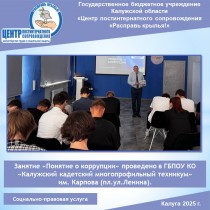 ГБУ КО ЦПС «Расправь крылья!» организовало мероприятие, направленное на тему борьбы с коррупцией, в ГБПОУ КО Калужский кадетский многопрофильный техникум» им. Карпова для учащихся, включая студентов из числа детей-сирот и детей, оставшихся без попечения родителей.Провел мероприятие заместитель директора Центра «Расправь крылья!» Головид И.И. -