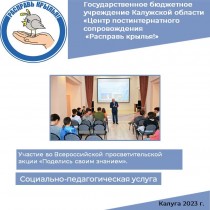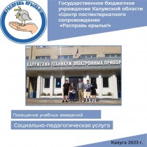 Продолжается работа в учреждениях среднего профессионального образования специалистами Центра «Расправь крылья!».В рамках выполнения государственного задания по сопровождению лиц из числа детей-сирот и детей, оставшихся без попечения родителей, 13 сентября сотрудники Центра под руководством заведующего отделения комплексной помощи Глущука О.А., посетили ГАПОУ КО «Калужский колледж экономики и технологий»... -
