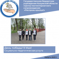 9 мая – Праздник Победы Красной армии и советского народа над немецко-фашистскими захватчиками в Великой Отечественной войне 1941-1945 годов. Сотрудники Центра «Расправь крылья!», совместно с Калужскими казаками, ребятами, проживающими в социальной гостинице и студентами СПУ (средне профессиональных учреждений), в рамках проекта: «Я служу России!» и образовательной программы: «Воспитываем гражданина», возложили цветы к могиле Неизвестного солдата на Площади Победы у Вечного огня. Во время мероприятия ветеран вооруженных сил Перелыгин В.И. сказал ребятам: «Подвиг героев калужской земли вечен. Помните подвиг дедов и прадедов, любите Россию и каждый день задавайте себе вопрос: что вы сделали для нашего Отечества».