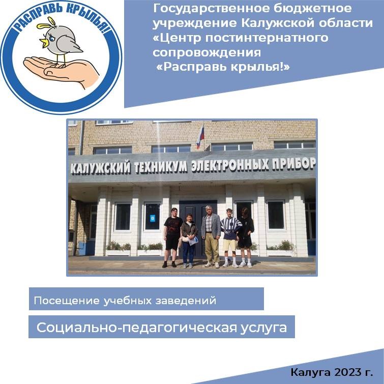 В рамках выполнения государственного задания по сопровождению лиц из числа детей-сирот и детей, оставшихся без попечения родителей, сотрудники Центра под руководством заведующего отделения комплексной помощи Глущука О.А., посетили ГБПОУ КО «Калужский техникум электронных приборов», ГБПОУ КО «Калужский коммунально-строительный техникум им. И.К. Ципулина» и ГБПОУ КО «Калужский технический колледж» для общения с социальными педагогами, заместителями по учебно-воспитательной работе. Обсудили планы взаимодействия и сотрудничества, дальнейшей совместной работы и привлечение выпускников на мероприятия на базе учреждений СПО и нашей гостиницы Центра «Расправь крылья!».