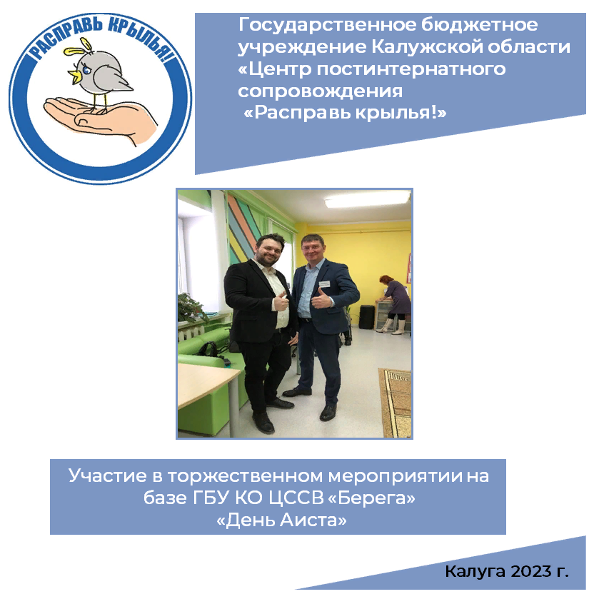 На базе ГБУ КО ЦССВ "Берега" прошло торжественное мероприятие "День Аиста", организаторами которого выступили Министерство труда и социальной защиты Калужской области и ГБУ КО ЦССВ "Берега". Цель мероприятия - повышение авторитета замещающих семей, повышение уровня компетенций кандидатов в замещающие родители и сотрудников органов опеки и попечительства по устройству детей на воспитание в замещающие семьи, профилактика эмоционального выгорания замещающих родителей и специалистов органов опеки. В мероприятии принял участие директор нашего Центра «Расправь крылья!» Симкин Дмитрий Владиславович а также участниками мероприятия стали замещающие родители, специалисты органов опеки, специалисты служб сопровождения, представители министерства труда и социальной защиты Калужской области, НКО, СМИ. Для всех участников мероприятия специалисты Центра "Содействие" провели тренинг по профилактике эмоционального выгорания