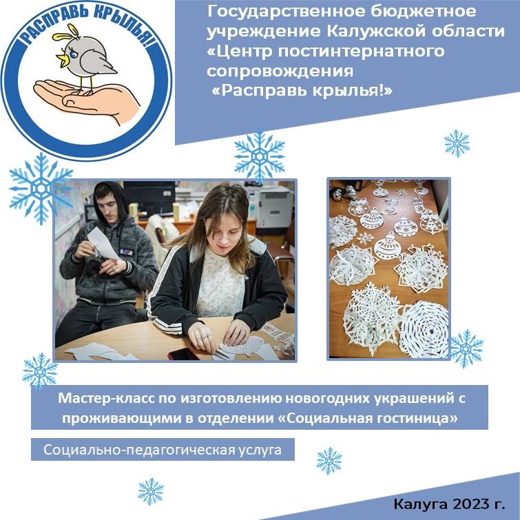 21 декабря для ребят, проживающих в социальной гостинице, прошел мастер-класс по изготовлению новогодних украшений из бумаги. Занятие провели специалисты отделения комплексной помощи и социального сопровождения под руководством заведующего Глущука О.А.