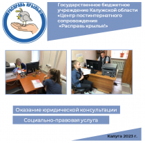 В рамках оказания социально-правовых услуг, сотрудники нашего Центра «Расправь крылья!», ежедневно помогают выпускникам, студентам СПУ г. Калуги и Калужской области из числа детей – сирот и детей, оставшихся без попечения родителей в решении их вопросов. Ребята обращаются с разными вопросами, кто то потерял документы, кому-то необходима помощь в составлении заявления, а кто то планирует заселяться в нашу социальную гостиницу. Всем обратившимся наши специалисты оказываю услуги в рамках государственного задания. Работу по юридическому направлению проводит ведущий юрисконсульт Нестерова У.К.