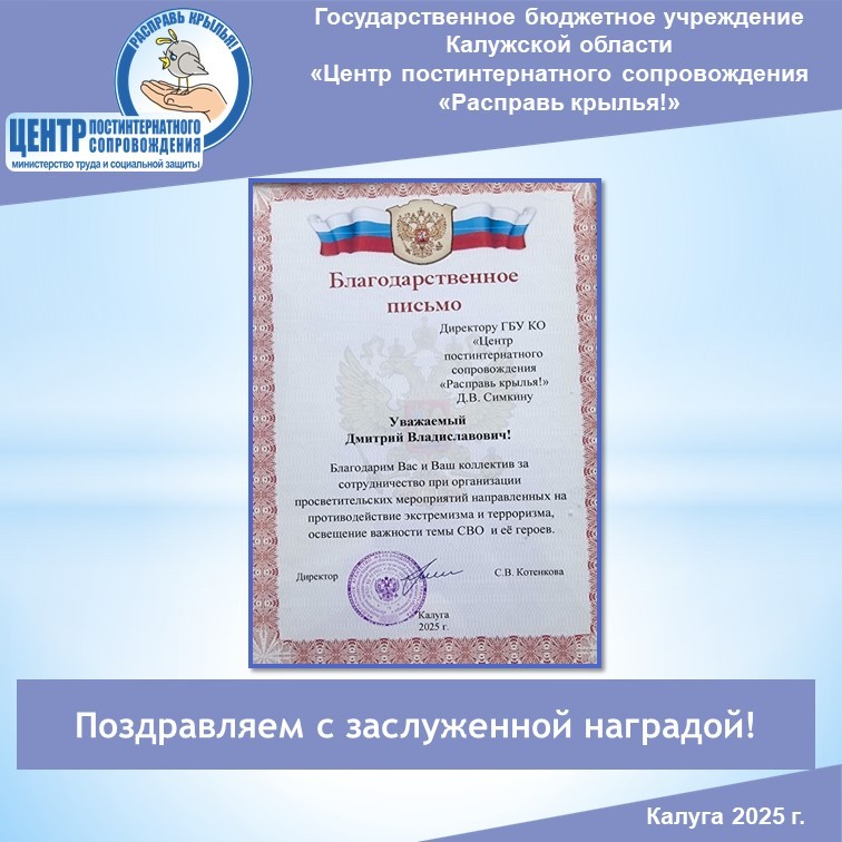 ГБУ КО Центр постинтернатного сопровождения «Расправь крылья!» проводит большую значимую работу в образовательных учреждениях Калуги и области. Юридические и просветительские мероприятия нашего Центра в формате лекций-бесед со студентами направлены на воспитание, формирование у молодежи ответственной гражданской позиции, понимание происходящего в мире, важности проведения и поддержки СВО (специальной военной операции), знания выпускниками своих прав и обязанностей, ответственности за свои действия, а также на воспитание чувства гордости за свою страну, патриотизма и любви к малой родине.