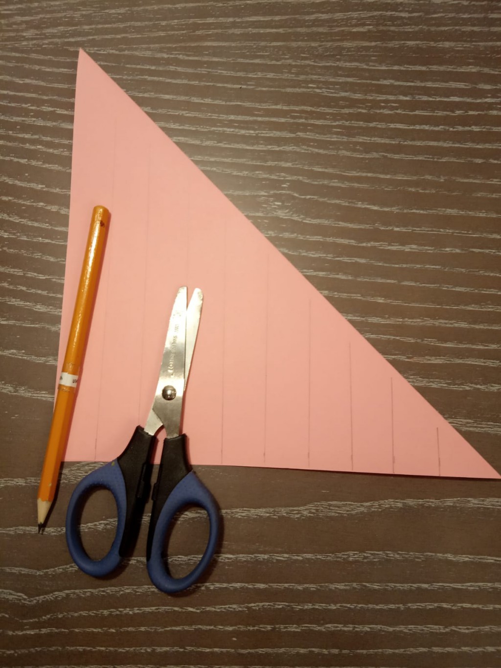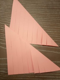 Для создания снежинки потребуется 6 листов цветной бумаги, простой карандаш, линейка, ножницы и клей. 1. Вырезаем 6 квадратов и складываем пополам. 2. Делим на равные по ширине полоски и разрезаем не доходя до края 0,5 см. Получаем 6 листочков. 3. Начинаем склеивать кончики каждой пары полосок. Четные полоски склеиваем по лицевой стороне, нечётные - переворачивая лист на другую сторону. Получили 6 ажурных фигурок. 4. Склеиваем их между собой за кончики. Украшение готово!