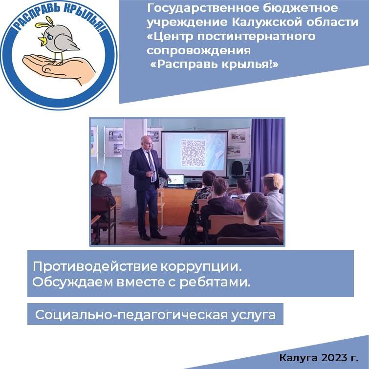 На площадке Калужского кадетского многопрофильного техникума им. А.Т. Карпова нашими специалистами Центра « Расправь крылья!» проведено мероприятие по противодействию коррупции и антикоррупционного поведения. На лекции обсуждалась история возникновения коррупции, лучший опыт стран в борьбе с этим злом, разбиралось законодательство и конкретные примеры профилактики коррупции. В Калужской области особенно знают, что профилактика и борьба с коррупцией позволяет динамично развиваться экономике, исполнительной и законодательной власти, повышает эффективность деятельности правоохранительных органов, спецслужб.