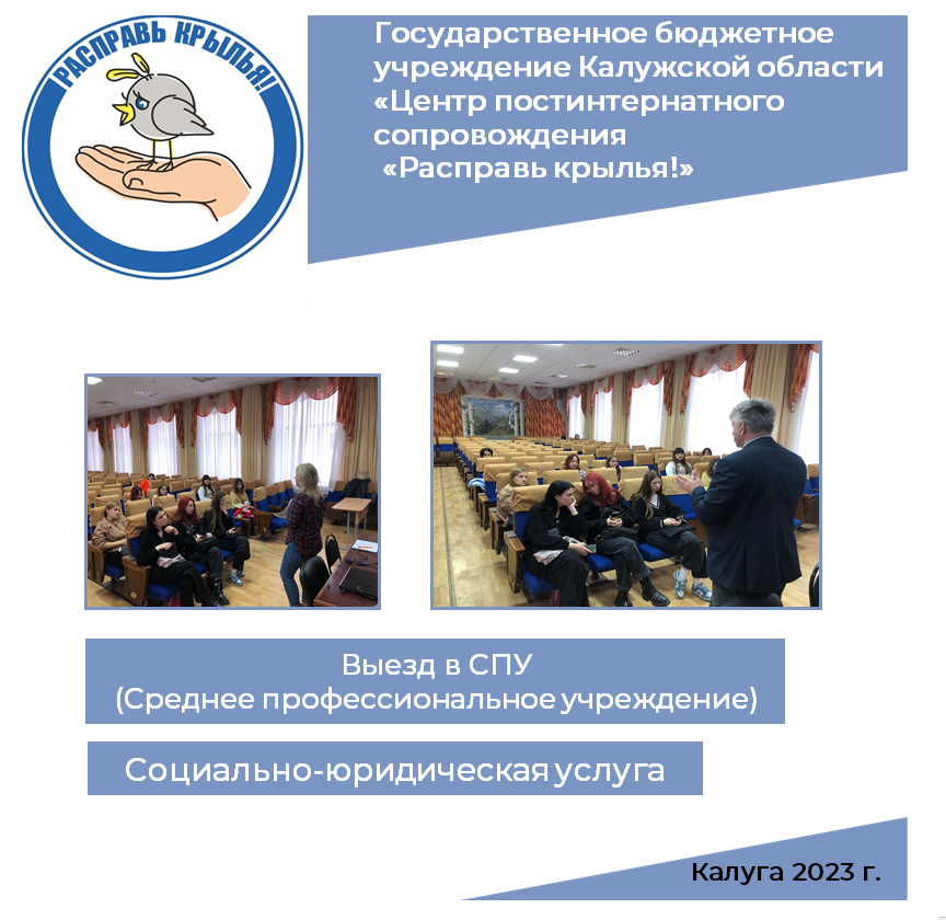 В рамках выполнения государственного задания, специалистами Центра «Расправь крылья!», зав. отделением комплексной помощи Глущука О.А. юриста – Нестеровой У.К. и эксперта Степушкина А.А. продолжается плановая работа в учреждениях СПО (среднего профессионального образования) по сопровождению выпускников.