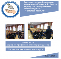 Сотрудники Центра «Расправь крылья!», встретились с выпускниками, рассказав ребятам про их права и обязанности, выплаты, меры поддержки, волонтерскую деятельность и какие документы необходимы при заселении в социальную гостиницу. Далее общение продолжилось с заместителем директора по воспитательной работе и социальным педагогом, ГБПОУ КО «Калужский колледж народного хозяйства и природообустройства», где сотрудники Центра , вместе с коллегами обсудили план на ближайший учебный год.