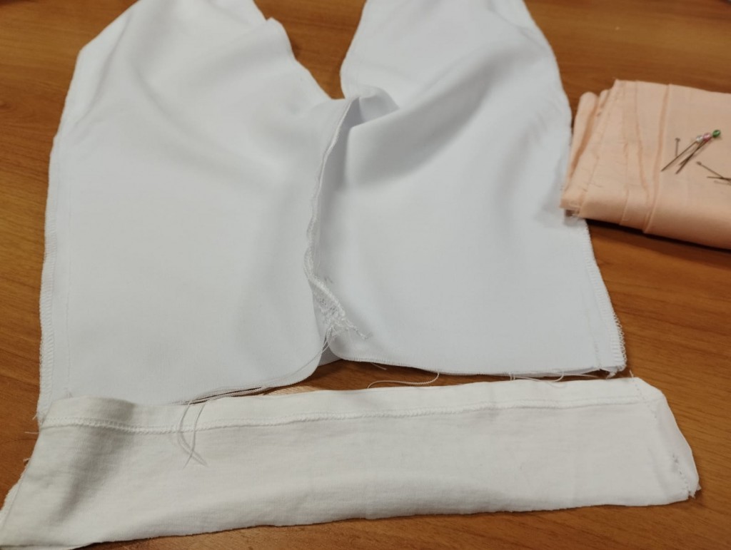 3) Пошив детских брючек для новогоднего утренника. Соединяем брюки из габардина и трикотажный пояс.