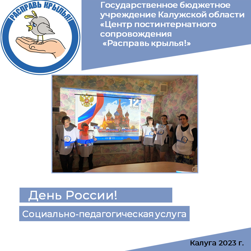 12 июня - день России и именно в этот день в Центре «Расправь крылья!» с проживающими, проведено мероприятие направленное на формирование позитивного образа службы по контракту. Мероприятие проведено в рамках проекта: «Я служу России!» и образовательной программы: «Воспитываем гражданина».