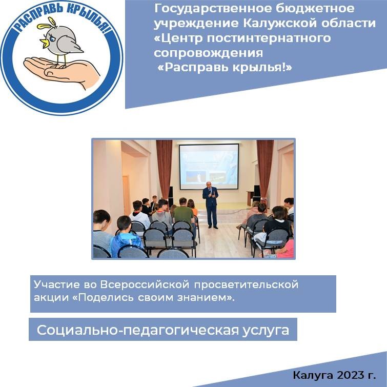 По всей стране сейчас проходит Всероссийская просветительская акция «Поделись своим знанием», организованная Российским обществом «Знание». В просветительской акции участвует наш Калужский Губернатор В.В.Шапша, Министры, руководители учреждений и активная общественность.