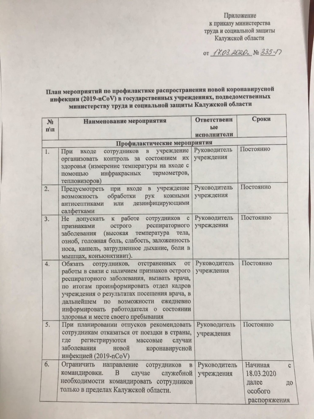 В соответствии с ПОСТАНОВЛЕНИЕМ ПРАВИТЕЛЬСТВА КАЛУЖСКОЙ ОБЛАСТИ от 17 марта 2020г. №200 «О введении режима повышенной готовности для органов управления и сил территориальной подсистемы Калужской области единой государственной системы предупреждения и ликвидации чрезвычайных ситуаций» и Приказом МИНИСТЕРСТВА ТРУДА И СОЦИАЛЬНОЙ ЗАЩИТЫ КАЛУЖСКОЙ ОБЛАСТИ от 17 марта 2020г. №335-п «О мерах профилактики распространения новой коронавируснойинфекции в государственных учреждениях, подведомственных министерству труда и социальной защиты Калужской области» ГАУ КО «Центр постинтернатного сопровождения «Расправь крылья!» закрыт на карантин с 18.03.2020г. до 03.04.2020г.
