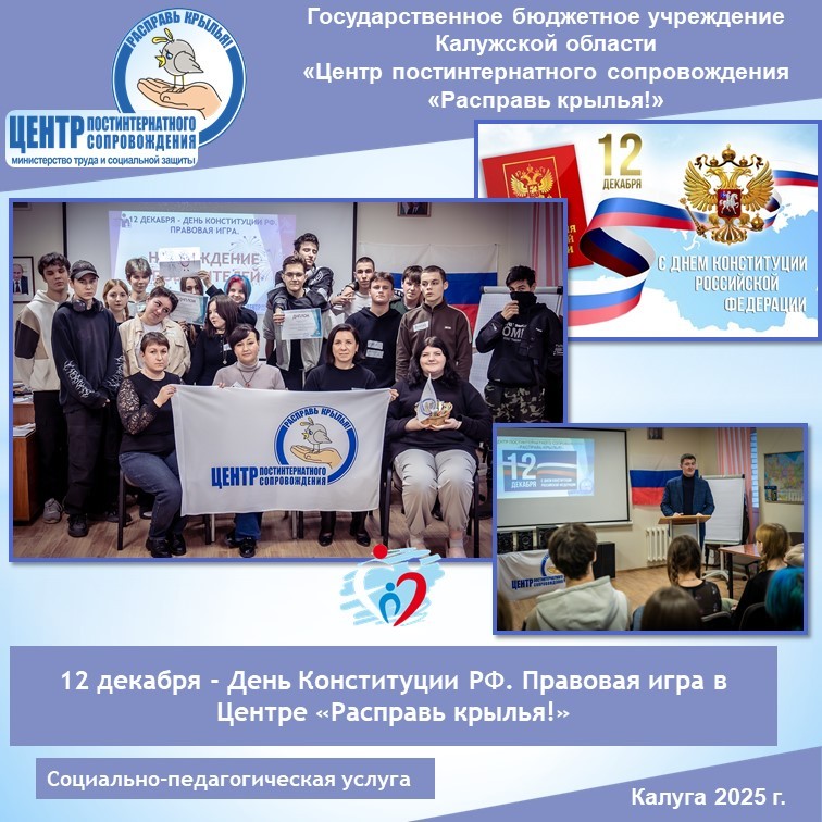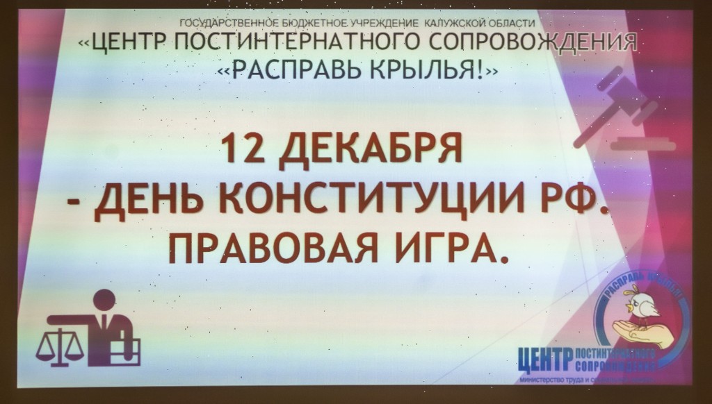 Специалисты нашего Центра в составе заведующего отделением комплексной помощи Глущука О.А., экспертов Нестюркиной Н.Н. и Кузнецовой С.А., психолога Крутовой Е.А., провели мероприятие в лекторском зале нашего Центра в формате правовой игры со студентами из числа детей-сирот, посвященное Дню Конституции РФ. Участвовали две команды студентов из «Калужского колледжа сервиса и дизайна» и «Калужского технического колледжа».