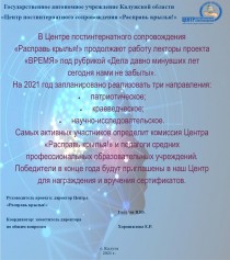 января 2021 года Центр «Расправь крылья!» встречал гостей - наставников молодых семей одноименного проекта, руководителем которого является заместитель директора по общим вопросам Елена Ростиславовна Хорошилова. Встреча была организована для благополучной социальной адаптации детей-сирот и молодых семей в рамках проекта «Молодая семья» и посвящена поэзии. Руководитель сообщества "Литературные вечера Калуги" Илья Алексеев и поэтесса Ирина Сулимова читали произведения собственного сочинения, также стихи Есенина С.А. военных лет и о любви. «Поэты – избранники судьбы, а их поэзия – сладкозвучная лира, призванная радовать, волновать и тревожить наши души». В данном случае души наших молодых семей и их детей. Встреча прошла в теплой дружеской обстановке, молодые мамочки отблагодарили наставников вкусным обедом и чаепитием, а Ирина Сулимова подарила учреждению сборник стихотворений собственного сочинения.