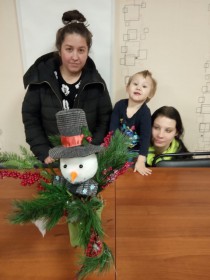 Мастерицы проекта «Молодая семья» под руководством специалиста Виктории Стрелец изготовили подарок Центру своими руками – рождественского снеговика. Для этого им понадобились: еловые ветки, ткань для шляпы, синтепон ленты, снежинки. Из синтепона «скатали» шар, закрепили его нитками. Из бусин сделали глазки и рот, нос из фетра. Для шляпы вырезали картонную заготовку и по ней из ткани вырезали необходимые детали. Склеили из картона шляпу и обшили тканью. Украсили шляпу лентой и бусинами. Бант снеговика обшили снежинками. Голову насадили на спицу и закрепили внутри «букета» из еловых лап. Всю конструкцию закрепили на подставке. Рождественский снеговик готов!