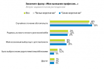 Мы попросили участников опроса продолжить фразу «Моя нынешняя профессия — это…», чтобы узнать, как они выбрали специальность, по которой в данный момент работают. Оказалось, что чаще всего это следствие случайного стечения обстоятельств (такой ответ выбрали 46% респондентов). Осознанно выбрали свою профессию в детстве или юности 18% опрошенных, а у 22% она «выросла» из хобби, увлечения.