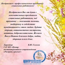 Поздравляем Вас от души с замечательным праздником социальных работников, чьё призвание — оказывать помощь, поддержку и содействие нуждающимся в этом людям. Будьте здоровы, оптимистично настроены, активны, доброжелательны. Желаем Вам и Вашим близким добра, любви, здоровья и всех благ. - Поздравляем Вас от души с замечательным праздником социальных работников, чьё призвание — оказывать помощь, поддержку и содействие нуждающимся в этом людям. Будьте здоровы, оптимистично настроены, активны, доброжелательны. Желаем Вам и Вашим близким добра, любви, здоровья и всех благ.