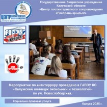 ГБУ КО ЦПС «Расправь крылья!» организовало мероприятие, направленное на пропаганду и профилактику в молодежной среде знаний в области безопасности и противодействия терроризму и экстремизму, в том числе методы вербовки в интернете, в ГАПОУ КО «Калужский колледж экономики и технологий» (площадка по ул. Новослободская) для учащихся, включая студентов из числа детей-сирот и детей, оставшихся без попечения родителей. Провел мероприятие заместитель директора Центра «Расправь крылья!» Головид И.И... - ГБУ КО ЦПС «Расправь крылья!» организовало мероприятие, направленное на пропаганду и профилактику в молодежной среде знаний в области безопасности и противодействия терроризму и экстремизму, в том числе методы вербовки в интернете, в ГАПОУ КО «Калужский колледж экономики и технологий» (площадка по ул. Новослободская) для учащихся, включая студентов из числа детей-сирот и детей, оставшихся без попечения родителей. Провел мероприятие заместитель директора Центра «Расправь крылья!» Головид И.И...