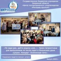 В нашей области стартовала Всероссийская премия «Поступок», носящая имя выдающегося актера и режиссера Сергея Пускепалиса. И наша Калужская земля стала первой, где на региональном уровне были отмечены первые лауреаты этой значимой премии. Коллектив сотрудников нашего Центра «Расправь крылья!» имел честь стать участником этого торжественного мероприятия, посвященного истинным героям нашего времени... - В нашей области стартовала Всероссийская премия «Поступок», носящая имя выдающегося актера и режиссера Сергея Пускепалиса. И наша Калужская земля стала первой, где на региональном уровне были отмечены первые лауреаты этой значимой премии. Коллектив сотрудников нашего Центра «Расправь крылья!» имел честь стать участником этого торжественного мероприятия, посвященного истинным героям нашего времени...