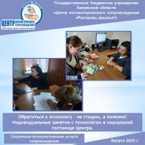 Дорогие наши выпускники! В Центре "Расправь крылья!" по ул.Кубяка, 26 в Калуге вы можете получить профессиональную помощь и консультацию психолога. Услуги психолога предоставляются в рамках 442-ФЗ «Об оказании социальных услуг гражданам РФ» и являются абсолютно бесплатными для выпускников нашей категории! Наши выпускники, проживающие в социальной гостинице Центра и находящиеся под нашим сопровождением, уже активно обращаются к психологу Крутовой Екатерине Алексеевне с самыми разными вопросами... - Дорогие наши выпускники! В Центре "Расправь крылья!" по ул.Кубяка, 26 в Калуге вы можете получить профессиональную помощь и консультацию психолога. Услуги психолога предоставляются в рамках 442-ФЗ «Об оказании социальных услуг гражданам РФ» и являются абсолютно бесплатными для выпускников нашей категории! Наши выпускники, проживающие в социальной гостинице Центра и находящиеся под нашим сопровождением, уже активно обращаются к психологу Крутовой Екатерине Алексеевне с самыми разными вопросами...