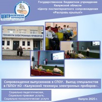 В рамках выполнения государственного задания по сопровождению лиц из числа детей-сирот и детей, оставшихся без попечения родителей, сотрудниками Центра постинтернатного сопровождения «Расправь крылья!» был совершён выезд в ГБПОУ КО «Калужский техникум электронных приборов» для работы c выпускниками нашей категории... - В рамках выполнения государственного задания по сопровождению лиц из числа детей-сирот и детей, оставшихся без попечения родителей, сотрудниками Центра постинтернатного сопровождения «Расправь крылья!» был совершён выезд в ГБПОУ КО «Калужский техникум электронных приборов» для работы c выпускниками нашей категории...