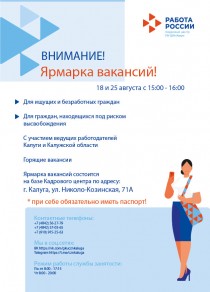 На базе Калужского кадрового центра проходят серии встреч работодателей с соискателями вакансий. 1️⃣5️⃣ крупных организаций ищут себе коллег в команду. Среди них: ПАО «Калужский двигатель», АО «Тайфун», АО «Информтехника и связь», ООО «Мануфактуры Боско», АО «ПРОДО Птицефабрика Калужская» и другие.