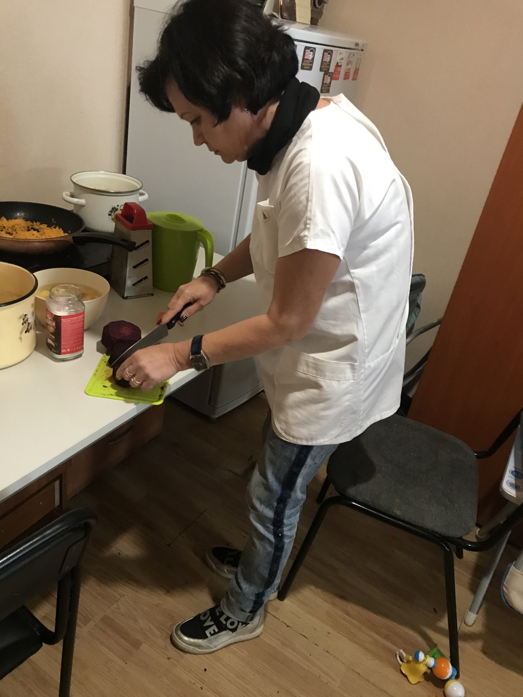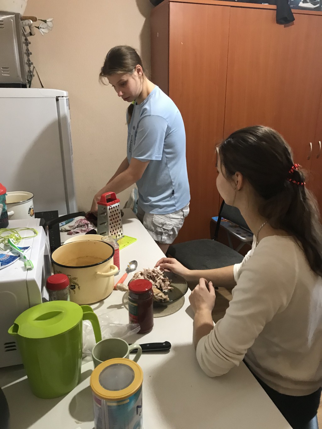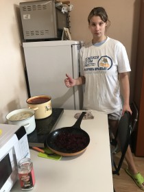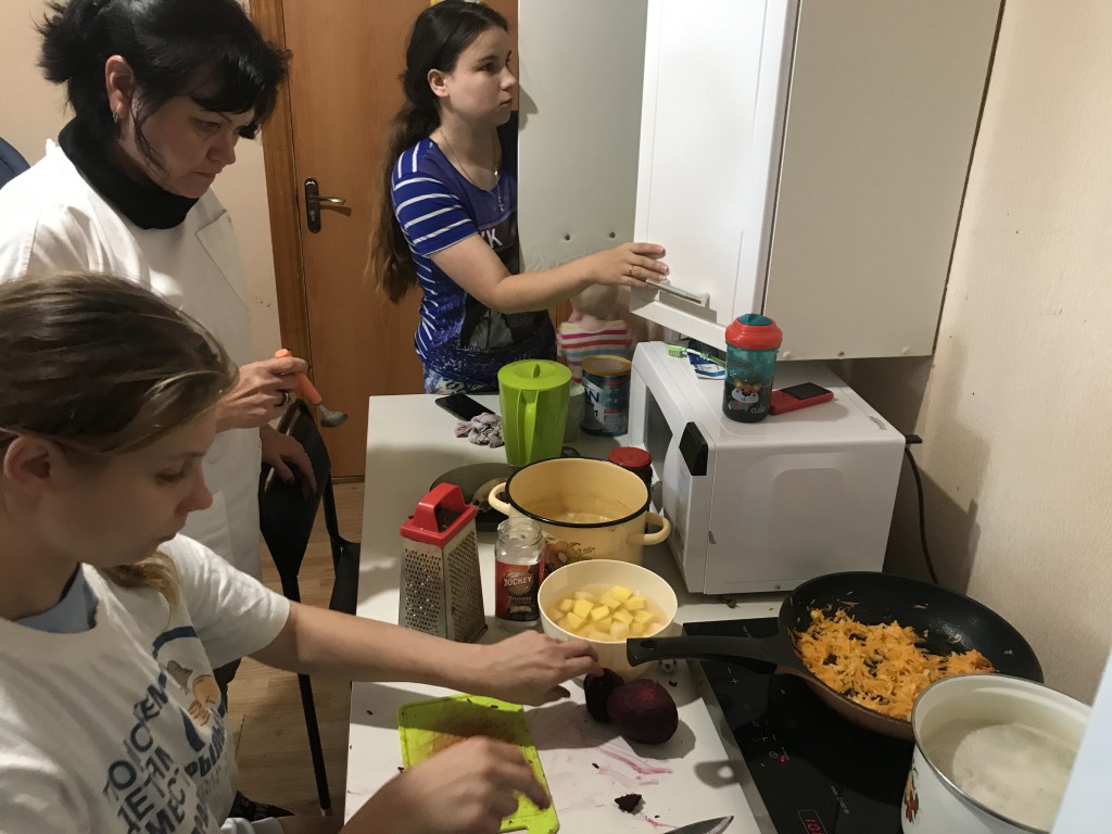 Начальным этапов в приготовлении любого блюда является подготовка и обработка продуктов. Овощи были выращены на огороде рядом с социальной гостиницей в рамках гранта «Комплекса Мер» благодаря проведению мастер класса: «Сад и огород». Главными продуктами в супе являются: свекла, картошка, морковка, лук, томатная паста, курица или свинина (в нашем случае курица), зелень, и не маловажный ингредиент который отвечает за сохранность яркого насыщенно алого цвета это-уксус. Молодые мамы центра постинтернатного сопровождения: «Расправь крылья» с радостью принялись за дело.