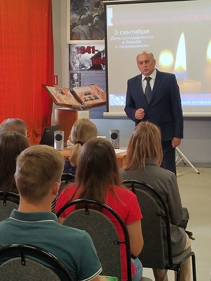 03.09.2018 года в МБУК «Городской досуговый центр» прошло мероприятие «Беслан. Скорбим», посвященное международному Дню солидарности в борьбе с терроризмом и приуроченное к Всероссийской акции «Капля жизни». Лекторская группа ГАУ КО «Центр постинтернатного сопровождения «Расправь крылья!» в составе заместителя директора по территориальному сопровождению Головида И.И. и заместителя директора по общим вопросам Серегиной М.А. рассказала студентам учреждений СПО (в том числе из числа детей-сирот) о трагических событиях, произошедших в первые сентябрьские дни 2004 года в городе Беслане.