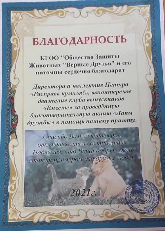 Всю прошлую неделю сотрудники Центра постинтернатного сопровождения «Расправь крылья!», активисты волонтерского движения клуба выпускников «Вместе» и студенты средних профессиональных образовательных учреждений активно принимали участие в акции «Лапы дружбы», посвящённой помощи бездомным животным. Собственными силами для наших четвероногих друзей удалось собрать значительную часть расходных материалов для ежедневного ухода: корма, миски для кормления, подстилки в клетки, тряпки хозяйственные, перевязочный материалы, йод, медицинские лезвия. 4 апреля подарки были переданы в приют «Верные друзья». Желающих присоединиться к оказанию совместной помощи ждём по нашему адресу: г. Калуга, ул. Кубяка, д. 26. Координатор волонтерского движения клуба выпускников «Вместе» - заместитель директора по общим вопросам Е.Р. Хорошилова, тел.: 8-902-933-00-75