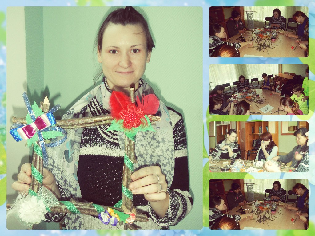 Как сделать рамку для фото в загородном стиле. Для изготовления такой рамки Алина принесла различные ветки, клей, ленточки, шишки, цветную бумагу и деревянный каркас. Ветки были самые разные, от разных деревьев, главное чтобы они были достаточно сухие и тонкие, чтобы можно было разломить на более мелкие кусочки. Загорелись работой все: Ирина Бауэр, Кононенко Кристина, Соколова Настя, Хромых Вика, Маша Зейтунян, Лена Абрамова. Рыжова Кристина. Паршикова Катя, Гладкая Наташа.