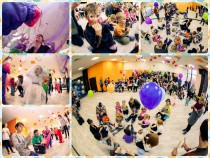 В красиво-украшенном зале собралось около 100 человек. Заранее привязали воздушные шарики по всей комнате, мы позаботились о том, чтобы веревочка у воздушного шарика была длинной, чтобы в случае если шар поднимется к потолку, наши дети смогли их достать.