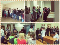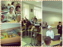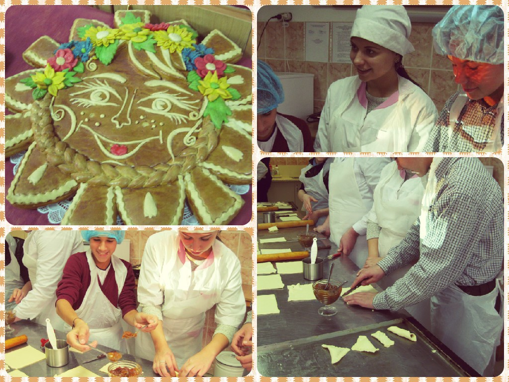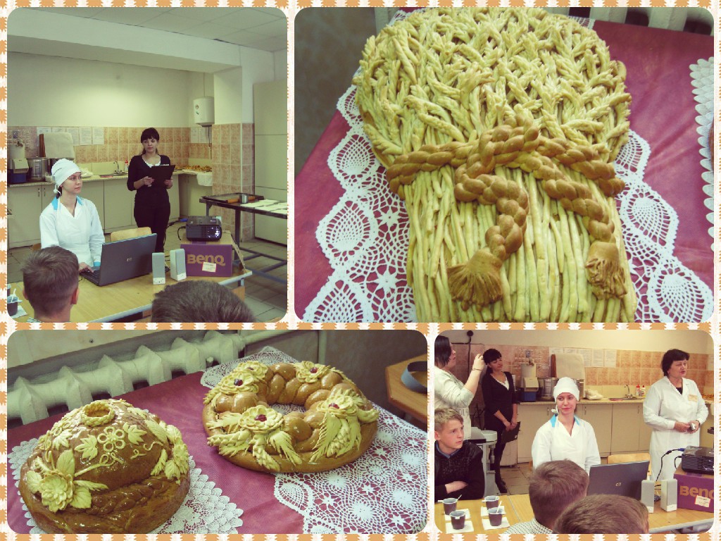 Сначала провели экскурсию по учебному заведению, показали учебные аудитории, компьютерный класс, спортивный зал. Затем мы оказались в аудитории, где проходят обучающие мастер-классы для студентов хлебобулочного отделения. Студенты 5 курса рассказали о том, чем дышит учебное заведение, о своих заслугах, победах. Мы увидели удивительную выставку караваев всевозможных форм: сноп зерна, солнышко, сердце. Целые произведения искусств, сделанные руками студентов.