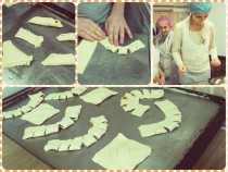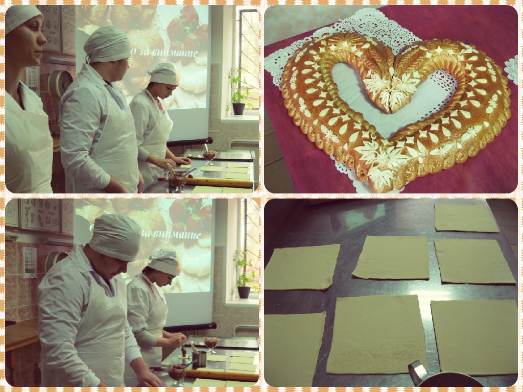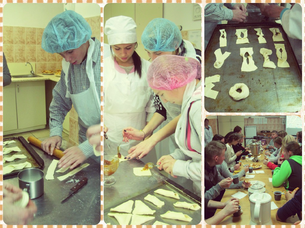Далее было самое интересное. Студенты показали ребятам, как быстро и ловко можно справиться со слоёным тестом, чтобы получились улитки, язычки, детские булочки, конвертики, рогалики. А затем ребята уже сами мастерили шедевры пекарского искусства. Как гостеприимные гости, студенты и преподаватели колледжа, пригласили нас на чай с изделиями из слоёного теста.