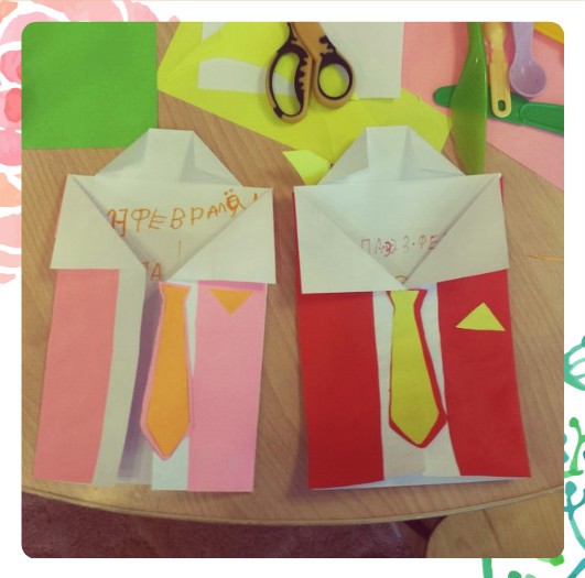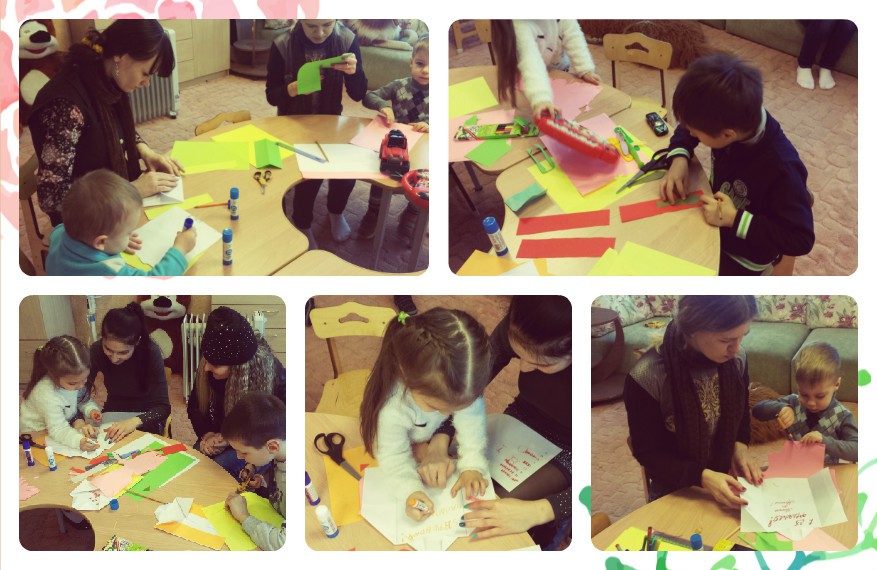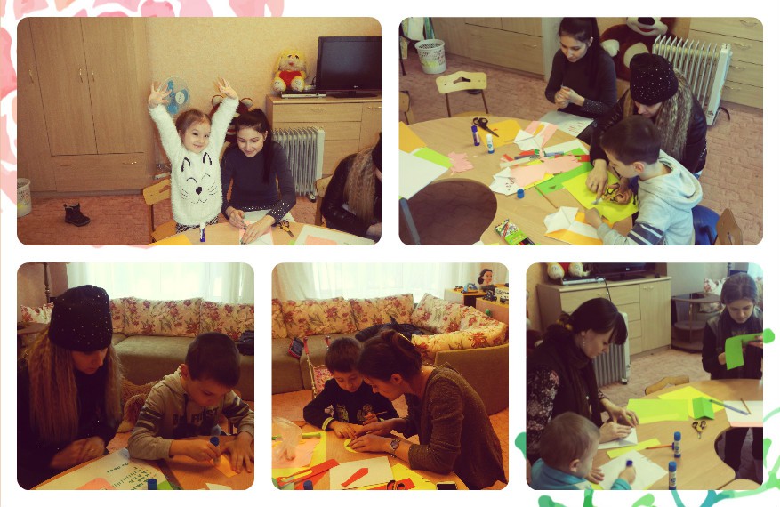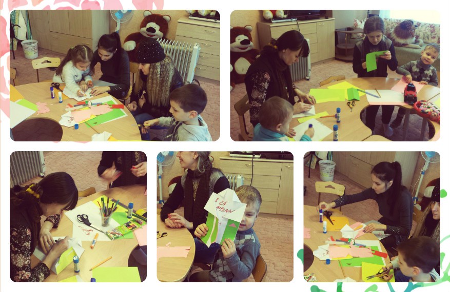 Наташа Гладких с сыном Валерьяном, Ермакова Оля с сыном Арсением, Гладкая Наталия с сыном Валерьяном, Шувалова Юлия с дочерью Светланой, Ермакова Ольга с сыном Арсением, Лебедева Елена с сыном Дмитрием и Хромых Сергей как обычно собрались в психологической комнате. Занятия стала проводить наш волонтер Эвелина Володина. Ребята на этот раз готовили подарки для своих пап, ведь впереди праздник 23 февраля. Папам будет очень приятно получить подарок, сделанный руками ребенка. Красивые рубашки с галстуком вызвали восторг у всех детей. И в результате получились: