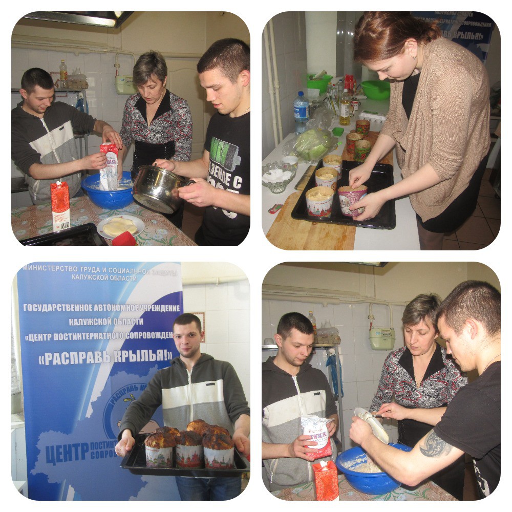 Так 06.04.2018г. в ГАУ КО «Центр постинтернатного сопровождения «Расправь крылья!» в рамках проекта «Доступно и практично» для ребят, проживающих в социальной гостинице центра, прошёл мастер – класс по приготовлению куличей и покраске яиц. Ребята с удовольствием познакомились с рецептом главного символа Пасхи. Сам процесс выпечки может быть очень увлекательным и интересным, стоит только вооружиться хорошим настроением, применить сноровку, терпение.