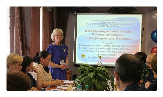 В рамках мероприятия по области работало 7 секций. Одна из секций «Гражданско-патриотическое воспитание в системе организаций для детей-сирот и детей, оставшихся без попечения родителей: проблема преемственности» была организована специалистами Центра «Расправь крылья!». По заданной проблеме выступили и поделились своим опытом: директор ГАУ КО «Центр постинтернатного сопровождения «Расправь крылья» И.Г. Кирилюк; директор ГКУ «Азаровский детский дом имени Попова В.Т.» Н.А. Пинаева, директор ГБУ «Кондровский детский дом» Е.И. Алмазова, руководитель клуба «Дорога» ГКУ КО «Содействие» А.Н. Зайцев; педагог-организатор ГБПОУ СПО «Перемышльский техникум эксплуатации транспорта» А.Н. Пономарева; Эксперт, руководитель проекта «Я служу России» И.И. Головид; заместитель председателя регионального отделения ДОСААФ России по подготовке специалистов А.Л. Иванов; директор спортивно-патриотического клуба «Полет» Е.В. Бровкин. Модератором секции была заместитель директора по социальной работе И.В. Ивкина.