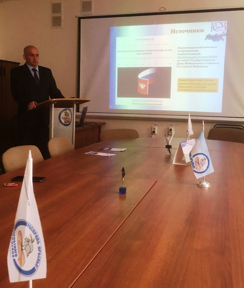 Занятие провел заместитель директора Иван Головид, который в форме презентации наглядно, доступно, понятно для аудитории представил материал о поправках в Конституцию, которые будут вынесены на голосование.