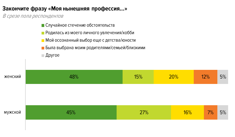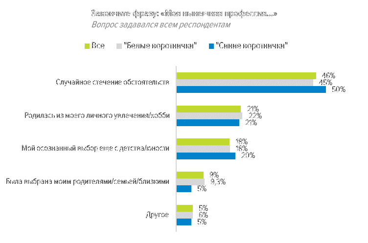 Служба исследований провела опрос среди 994 соискателей, чтобы выяснить, легко ли превратить свое хобби в профессию.Мы попросили участников опроса продолжить фразу «Моя нынешняя профессия — это…», чтобы узнать, как они выбрали специальность, по которой в данный момент работают. Оказалось, что чаще всего это следствие случайного стечения обстоятельств (такой ответ выбрали 46% респондентов). Осознанно выбрали свою профессию в детстве или юности 18% опрошенных, а у 22% она «выросла» из хобби, увлечения.