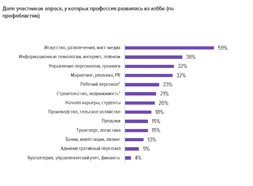 Чаще всего хобби превращается в профессию у представителей профобласти «Искусство, развлечение, массмедиа» (59%), на втором месте представители «ИТ, интернет, телеком» (38%).