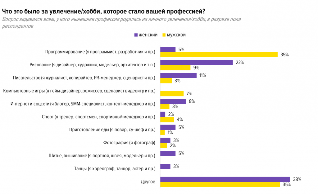 Возможно, это объясняется тем, что в качестве хобби, которое чаще всего превращалось в профессию, наши респонденты назвали программирование, а программированием мужчины пока увлекаются чаще женщин. На втором месте — рисование.