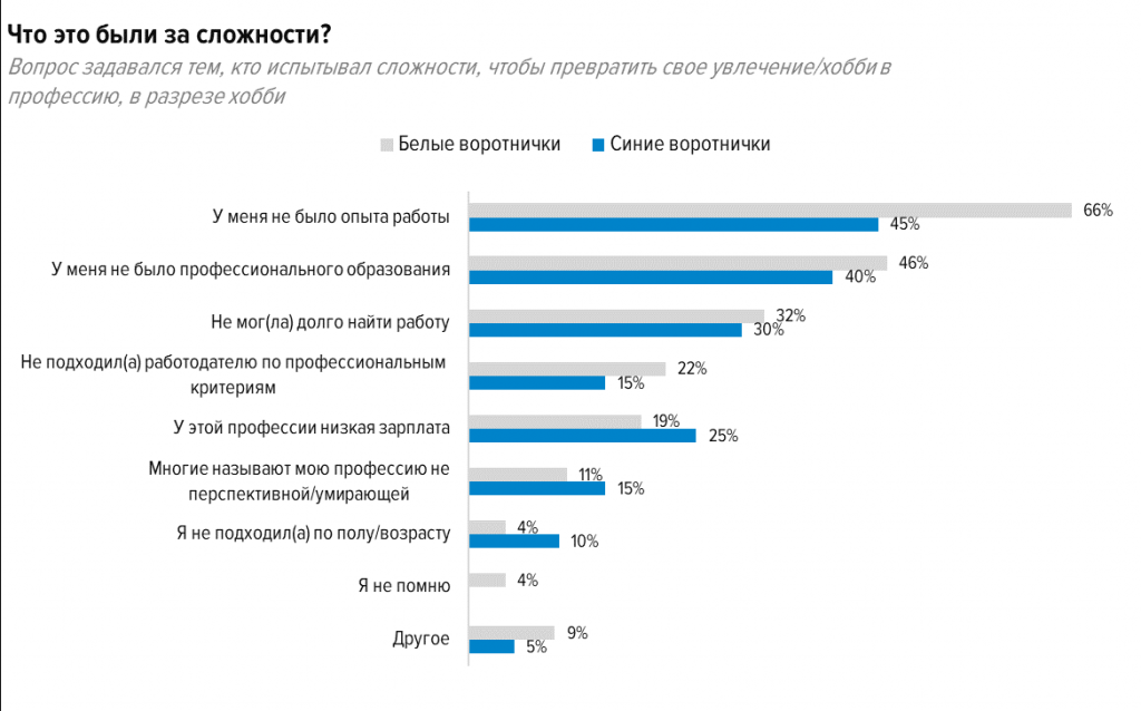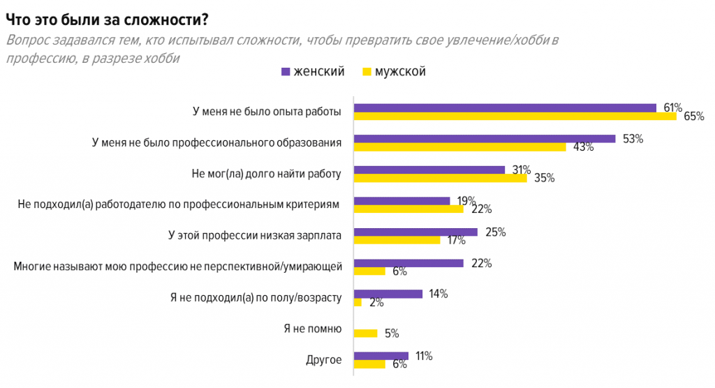 Интересно, что превратить хобби в профессию чаще получается у мужчин, чем у женщин (27% против 15%), если судить по результатам опроса.