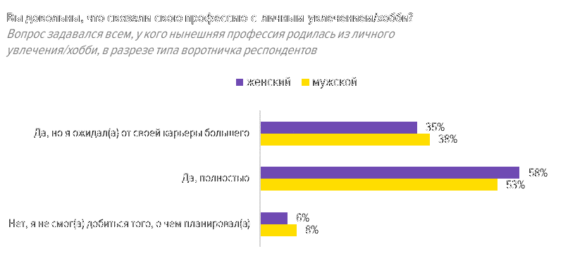 На вопрос о том, довольны ли они тем, что связали свою профессию с хобби, 55% тех, чья профессия возникла из хобби, ответили «Да, полностью», 37% ответили «Да, но я ожидал(а) большего», и 8% выбрали вариант «Нет, я не смог(ла) добиться того, что планировал(а)».