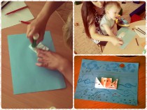 На этот раз занятие школы для мам с детьми было посвящено теме «Корабль – оригами», на котором присутствовали Олеся Ломакина с сыном Максимом и Наташа Гладких с сыном Валерьяном. Сначала преподаватель прочитала детишкам стихотворение А. Барто «Кораблик», а затем стали рассматривать картинки кораблей, из чего состоит корабль, из каких подручных средств его можно сделать. Мамочки познакомились с искусством оригами, и вскоре появились замечательные кораблики, которые поплыли по бурному морю, в котором плавают не только кораблики, но и рыбки.