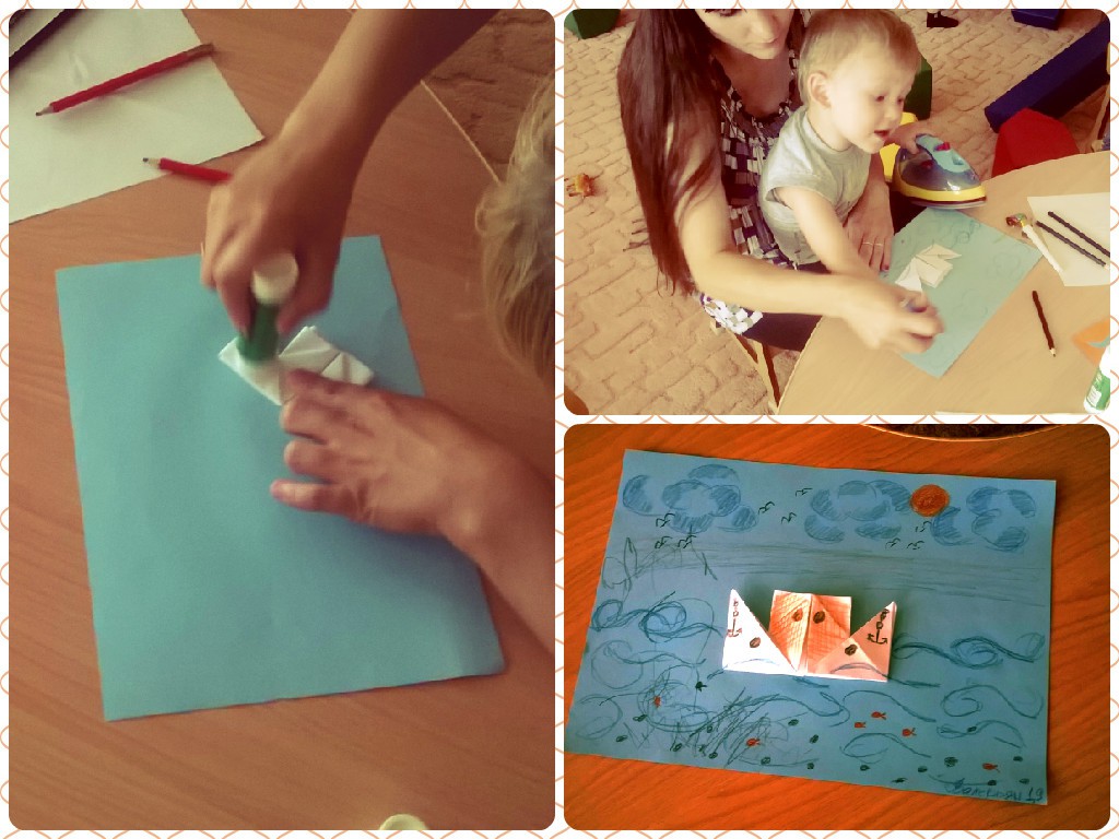 На этот раз занятие школы для мам с детьми было посвящено теме «Корабль – оригами», на котором присутствовали Олеся Ломакина с сыном Максимом и Наташа Гладких с сыном Валерьяном. Сначала преподаватель прочитала детишкам стихотворение А. Барто «Кораблик», а затем стали рассматривать картинки кораблей, из чего состоит корабль, из каких подручных средств его можно сделать. Мамочки познакомились с искусством оригами, и вскоре появились замечательные кораблики, которые поплыли по бурному морю, в котором плавают не только кораблики, но и рыбки.