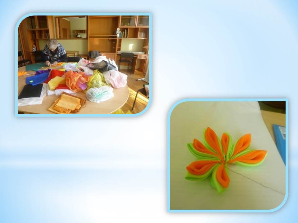 Шпильки и гребни традиционно используются в японских причёсках, но в настоящее время украшения в технике Канзаши обрели свою популярность далеко за пределами Японии. Так называемые «канзашки» сейчас служат не только украшением для волос, из них делают броши, используют в качестве декора интерьера и т. д. Поэтому не случайно на одной из встреч Анечка Демина попросила организовать мастер-класс в данной технике, чтобы сделать ободок для своей дочки Кирочки. Мастер-класс под руководством Евгении Петровны Требиной прошел 6 мая 2015 года с использованием необходимых материалов и приспособлений, и в результате появились первые лепестки для ободка. Анечка с таким усердием училась делать лепестки Канзаши, так как техника Канзаши заключается в следующем: множество небольших ровных квадратиков ткани сворачиваются определённым образом и собираются в цветок. Сами лепестки между собой сшиваются или склеиваются. В итоге появился первый цветочек, и мы теперь ждем продолжения мастер-класса, чтобы доделать до конца ободок для маленькой Киры.