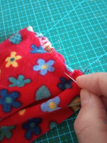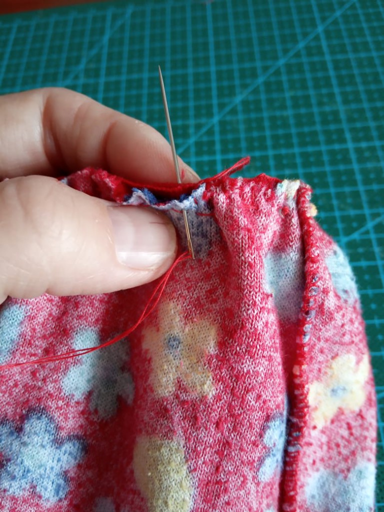 Шаг 4. Собираем край штанины, швом "иголка вперёд". Ширина штанины должна соответствовать ширине манжета, при этом манжет нужно растянуть по ширине.