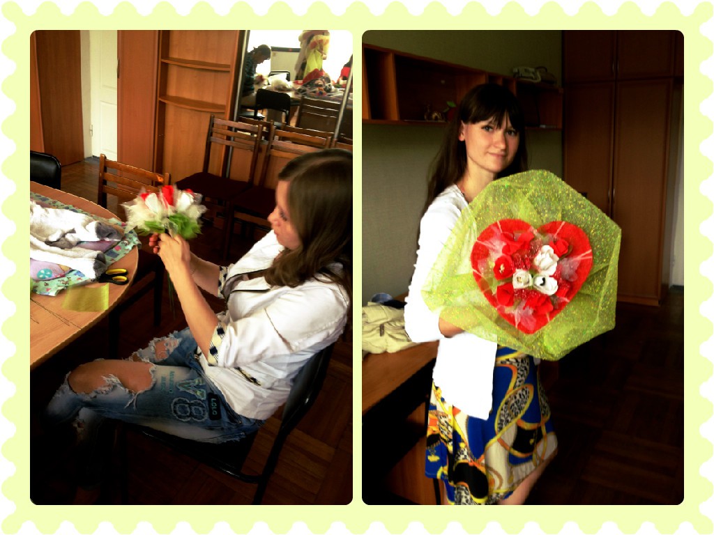 Ведь дарить такие букеты одно удовольствие, особенно детям - попробуйте сами и увидите бурю восторга у нашего подрастающего поколения, которое уже трудно чем-либо удивить. Посмотрите, какие уникальные букеты появились у наших мамочек и с каким настроением они делали их – не передать словами.