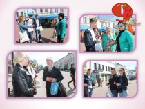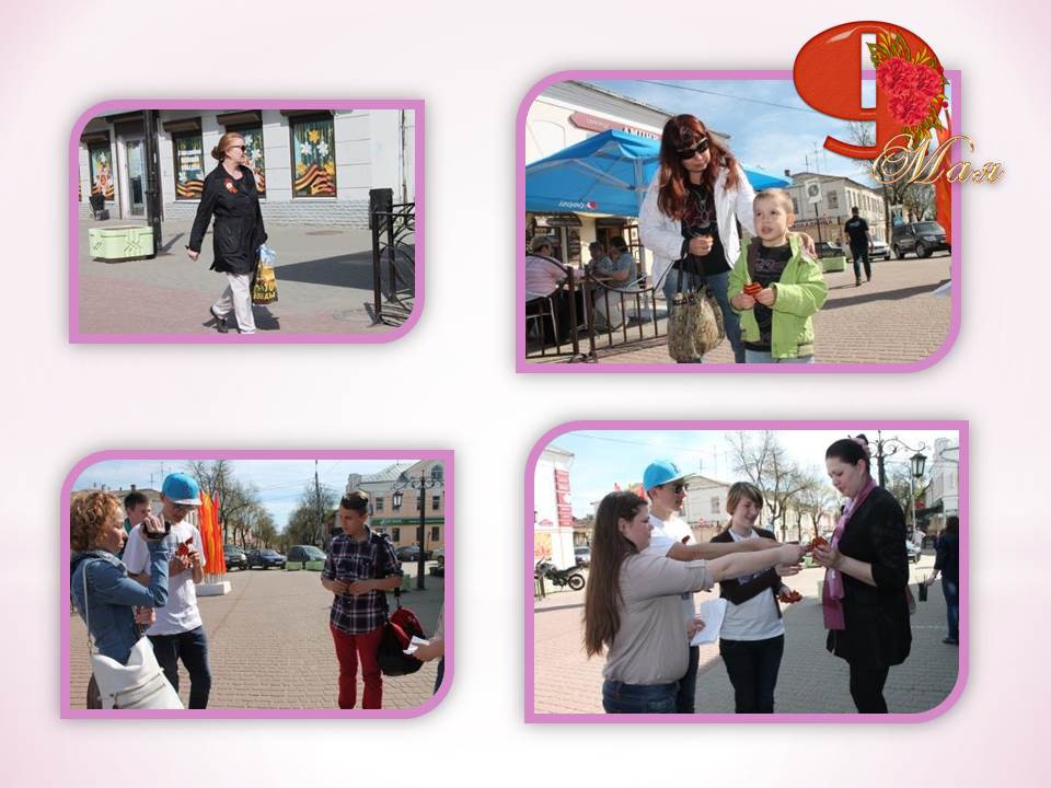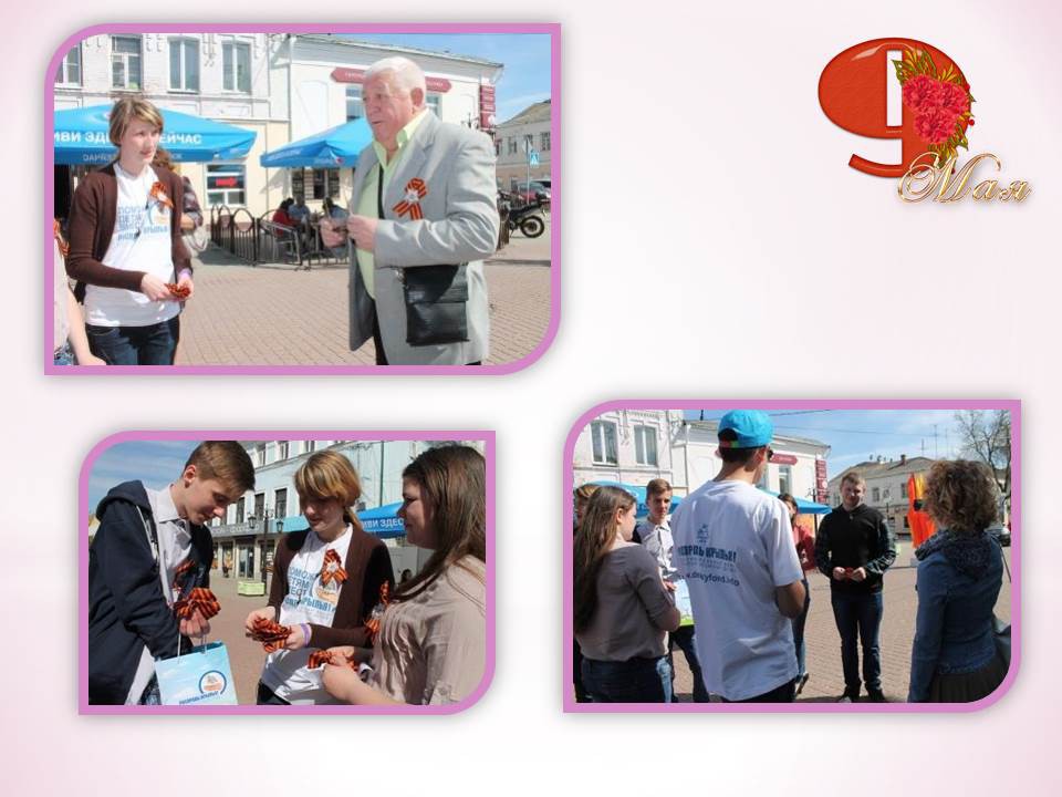 7 мая мы вышли на центральные улицы города Калуги, чтобы поздравить горожан с наступающим праздником и вручить им изготовленные символы Победы. Ребята подходили к прохожим, задавали им вопросы, беседовали о празднике и дарили георгиевские ленточки. Калужане охотно откликнулись на Акцию: рассказывали о ветеранах своей семьи, поздравляли их и были очень рады подарку. После Акции ребята расходились довольные и радостные, в этот день они в полной мере прочувствовали, что значит «Блаженнее давать, нежели принимать». Сегодня они дарили прохожим не только подарки, но и свои улыбки и положительные эмоции. Спасибо всем, кто поддержал нас в поведении Акции!